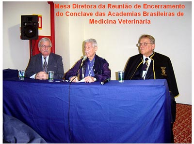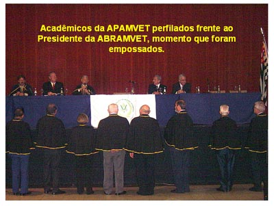 A Mesa Diretora da sessão de posse dos Acadêmicos foi formada pela liderança viva da Medicina Veterinária Brasileira, sendo Presidida pelo Acadêmico Professor Doutor Jadyr Vogel – digníssimo Presidente da Academia Brasileira de Medicina Veterinária e composta pelo Acadêmico Professor Doutor Eduardo Harry Birgel – Presidente “pro tempore” da APAMVET, pelo Médico Veterinária Francisco Cavalcante de Almeida – ilustre Presidente do Conselho Regional de Medicina Veterinária em São Paulo, Médico Veterinário Josélio Andrade Moura, Médico Veterinário Professor Zohair Saliem Sayeg – eminente presidente da Sociedade Paulista de Medicina Veterinária e presidente do 34º CONBRAVET. A Mesa Diretora contou ainda com a honrosa presença do Médico Veterinário Orlando Pessuti – ilustre Vice Governador do Estado do Paraná. O Cerimonial foi comandado com brilhantismo impar pelo Professor Doutor Pedro Primo Bombonato, mui querido e ilustre Mestre de Cerimônias. A sessão foi instalada com audição do Hino Nacional, cantado com emoção evidente pela platéia e pelo desfraldar dos Pavilhões do Brasil, de São Paulo e da Academia Paulista de Medicina Veterinária, sendo porta bandeira o Presidente da APAMVET – Acadêmico Eduardo Harry Birgel.